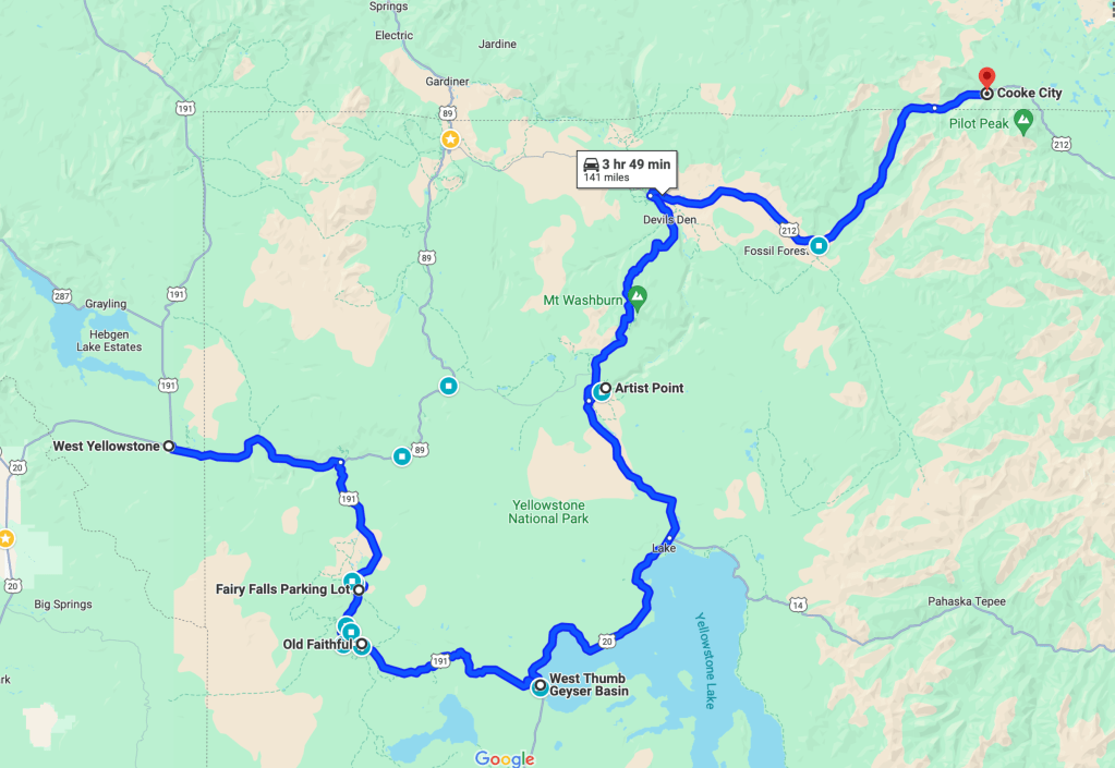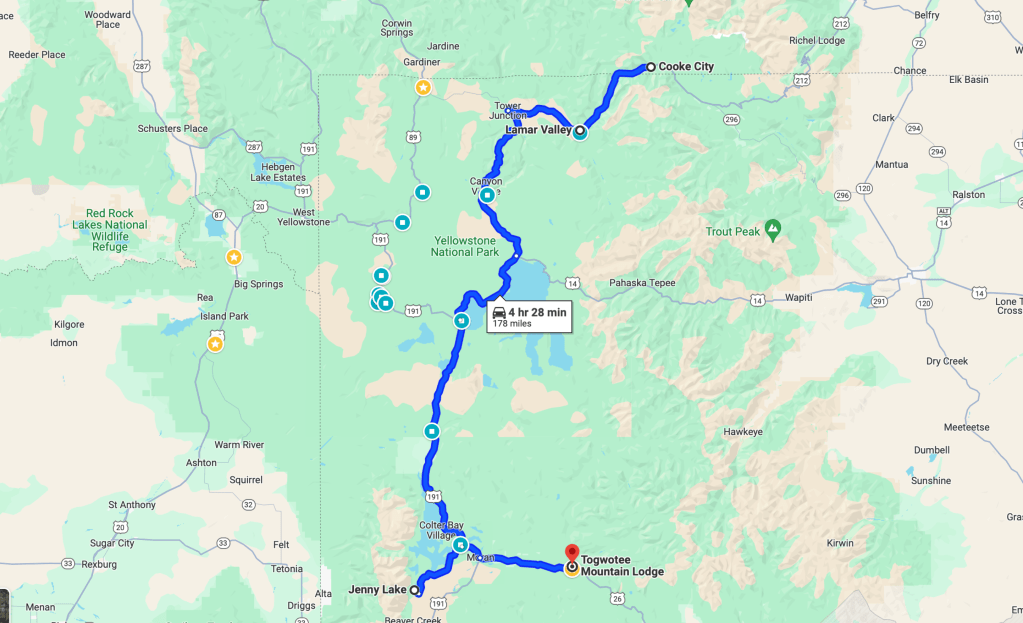 In the morning, we couldn’t go to Lamar Valley early, so we had breakfast at Cooke City Coffee, which offers a variety of freshly made options. Our goal was to reach Jenny Lake in Grand Teton National Park, about 3 hours away. However, we made several stops in Yellowstone to see wildlife and landscapes.