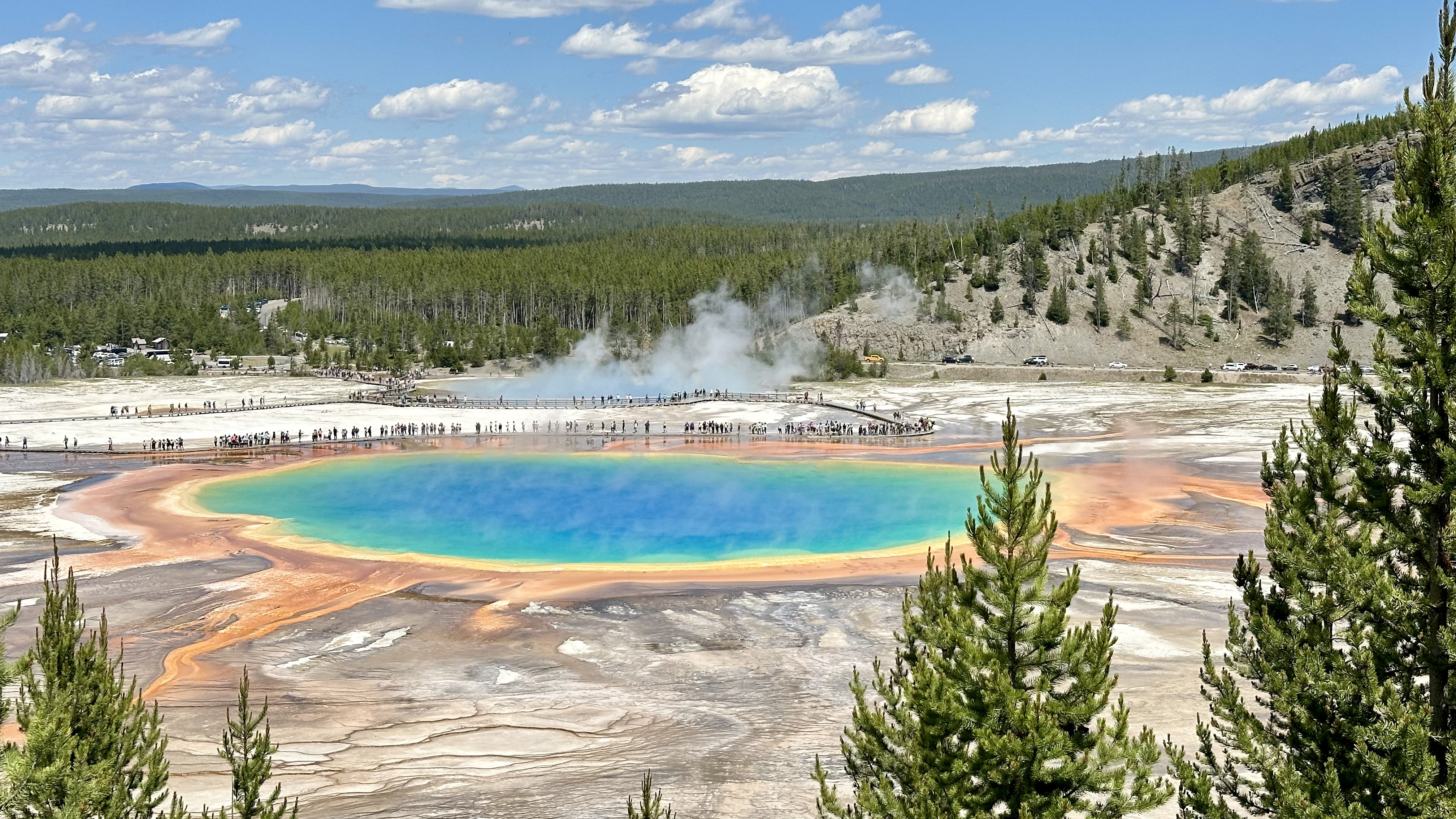 Afterwards, we made a quick stop at Gibbon Falls, where the overlook is right at the parking lot. Then, we drove to Grand Prismatic Spring and walked around the loop, which took us about 45 minutes. It was amazing to see the beautiful formations up close. I highly recommend this, though due to constant steam, you can barely see the Grand Prismatic Colors. We planned to hike the Fairy Falls Trail the next day for a top view of Grand Prismatic. We spent the night in West Yellowstone.